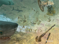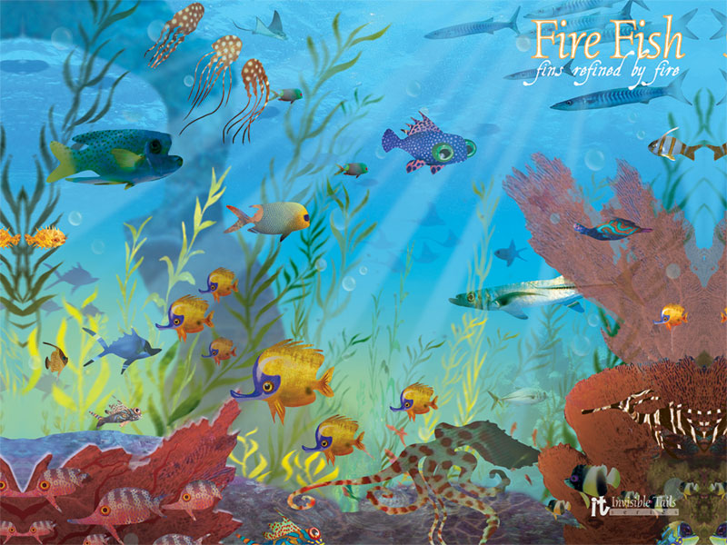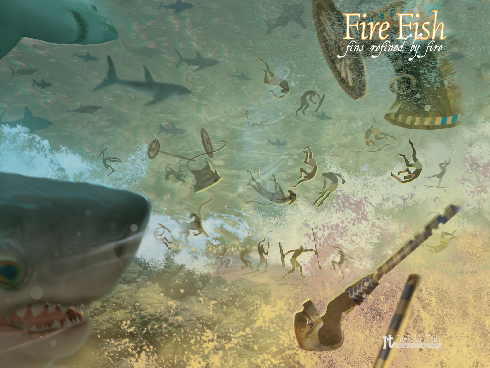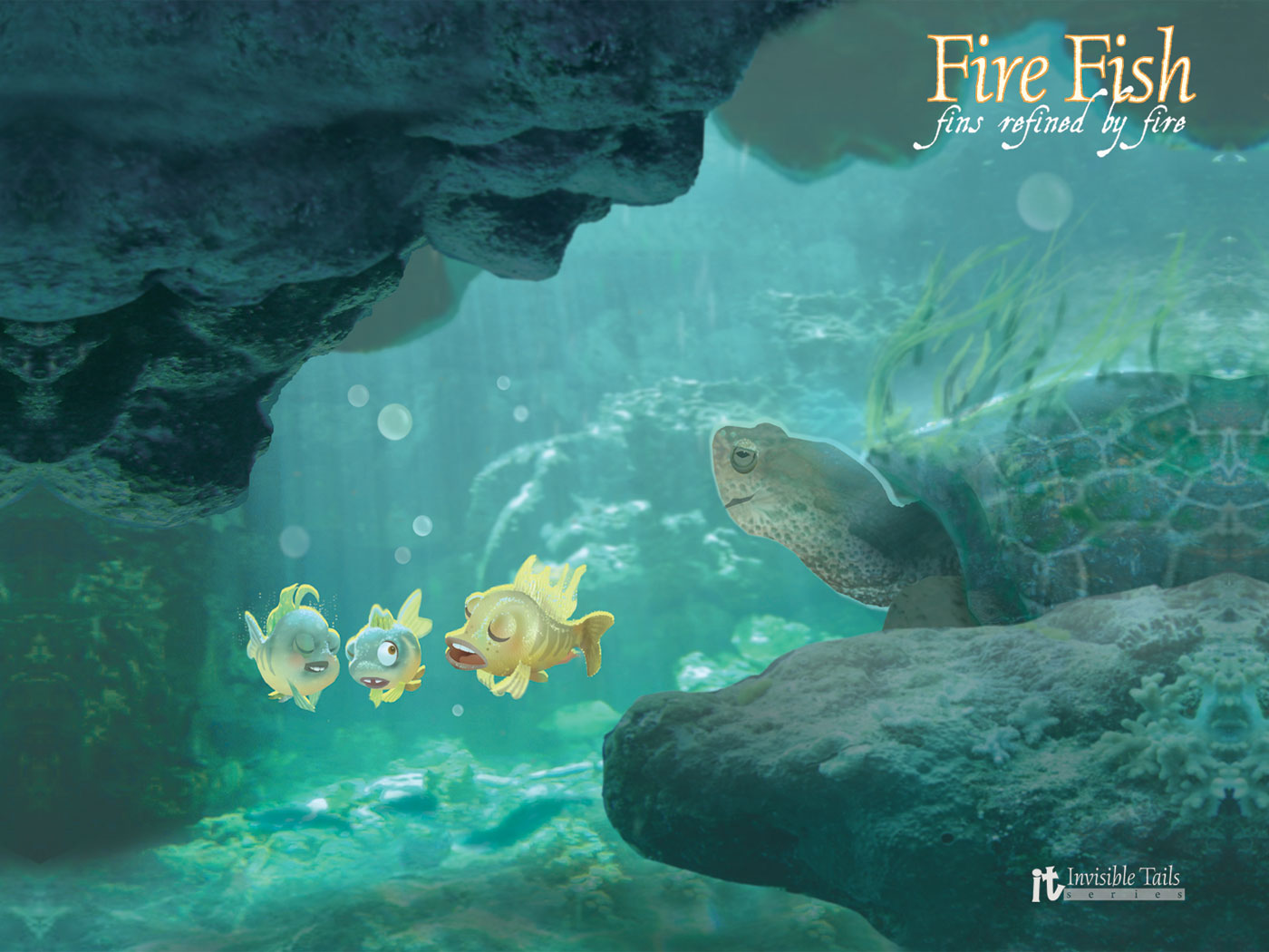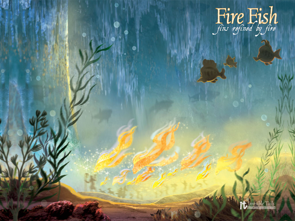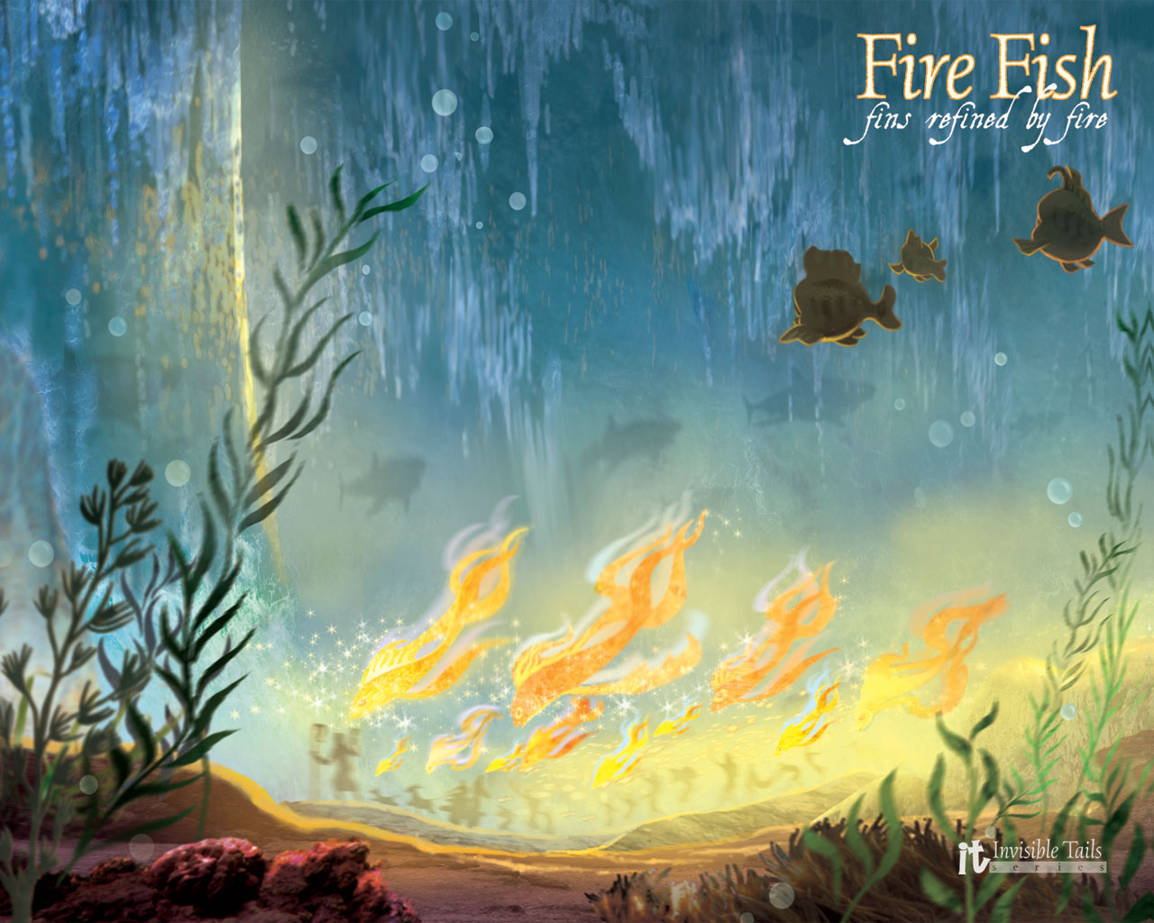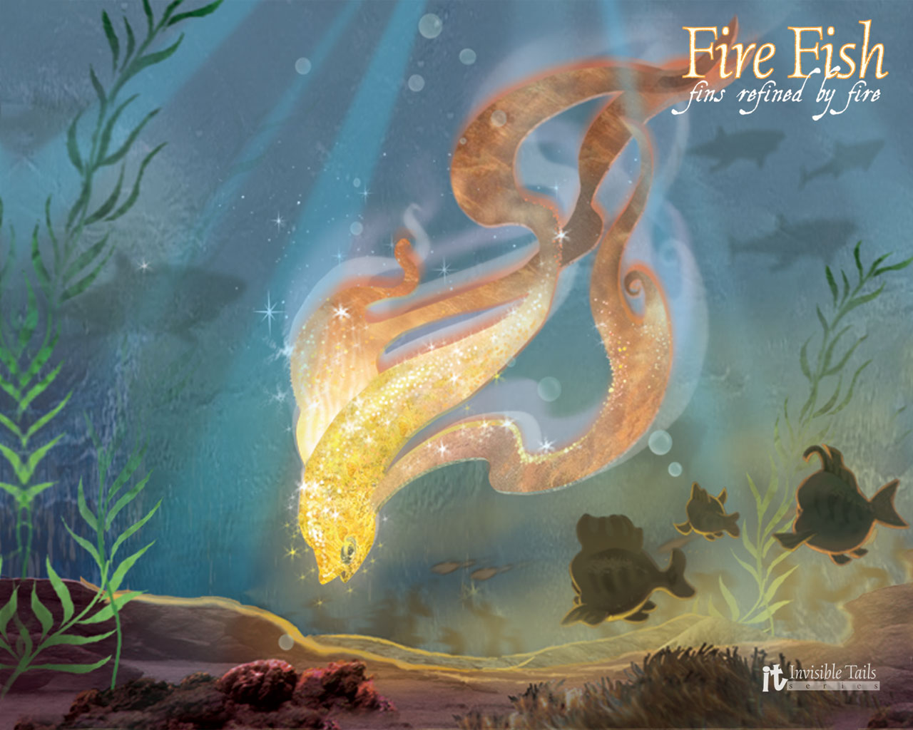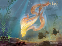Sarai, Sesom and RaaOn watch as radiant Fire Fish swim by in a brilliant, shining river.